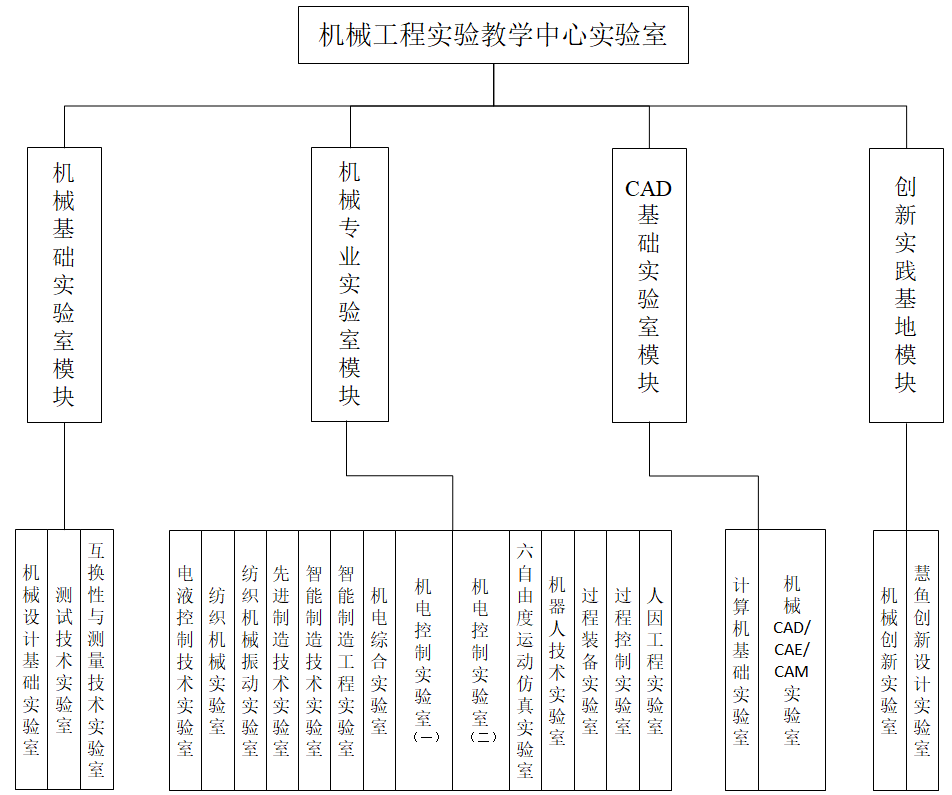 实验教学中心按实验室功能划分为四个功能实验室模块:机械基础实验室模块、机械专业实验室模块、CAD基础实验室模块和创新实践基地模块,共包含21个实验分室。