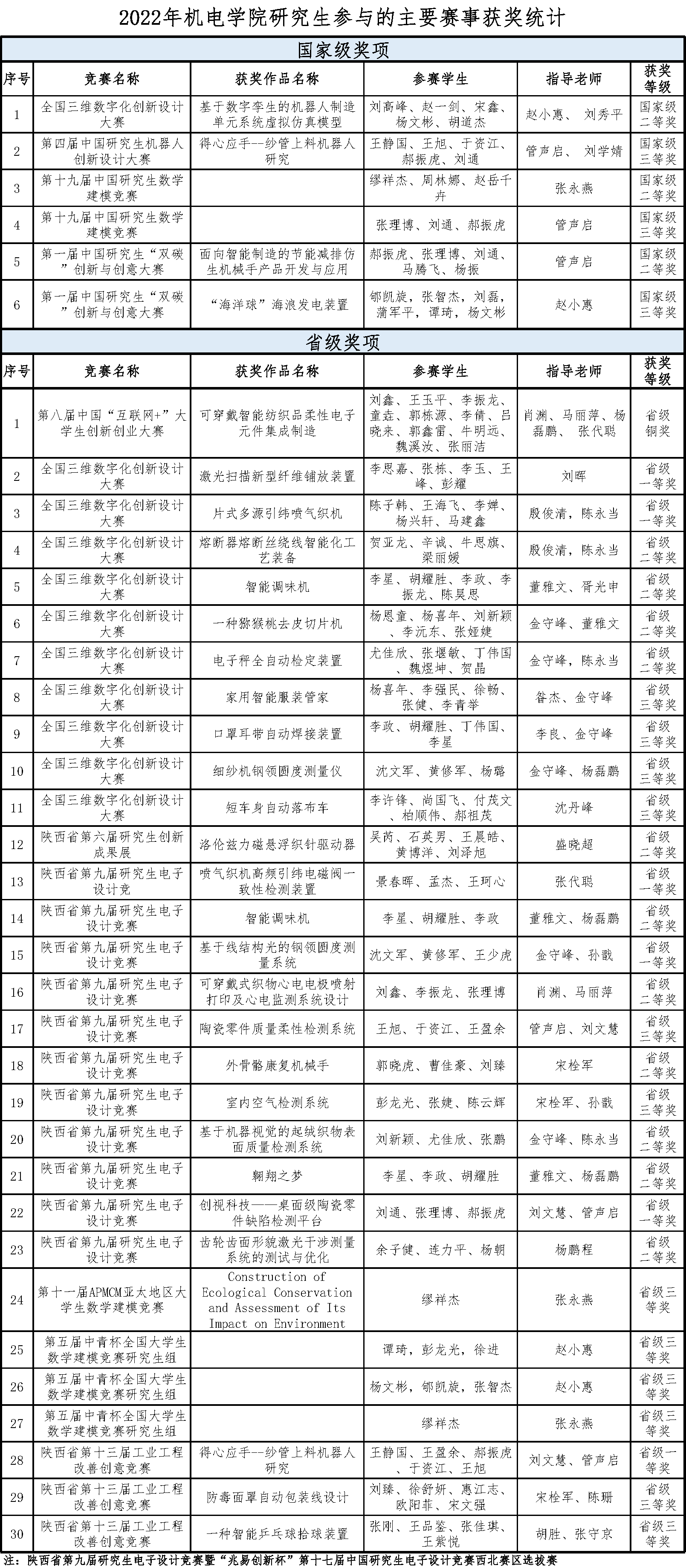 2022年机电学院研究生参与的主要赛事获奖统计