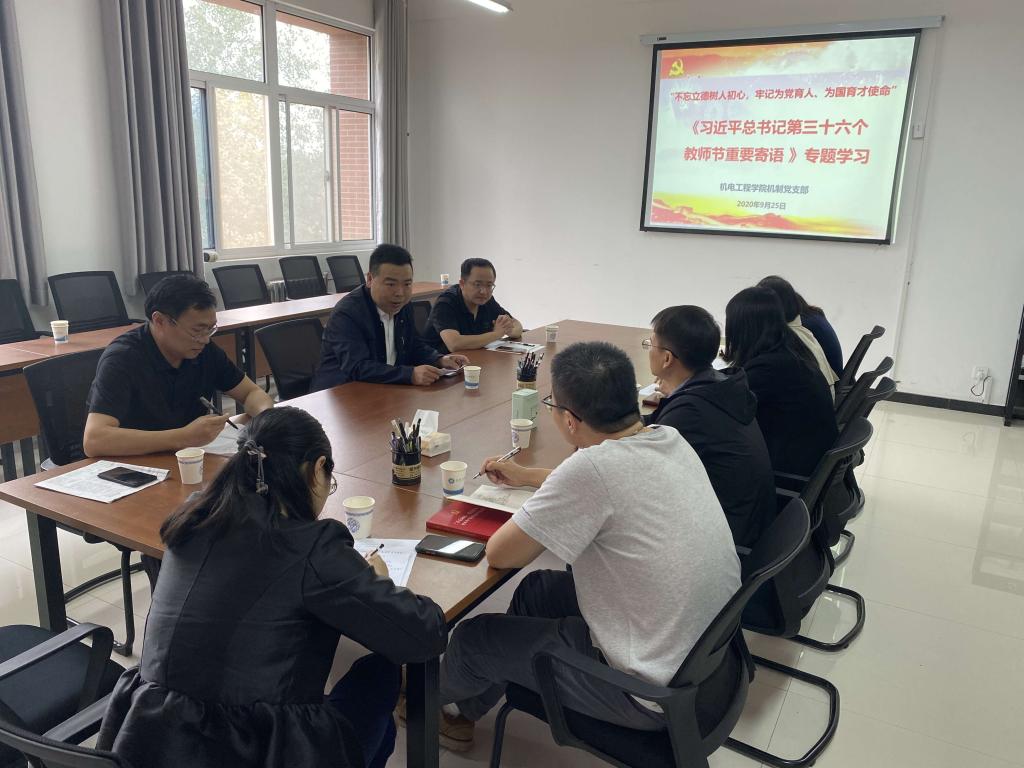 2020年9月25日下午,澳门十大信誉网赌大全机制党支部在临潼校区笃行楼315党团活动室召开组织生活会,专题学习习近平总书记教师节重要寄语。校党委副书记赵小峰作为该支部联系校领导参加会议。机制党支部书记管声启主持会议。