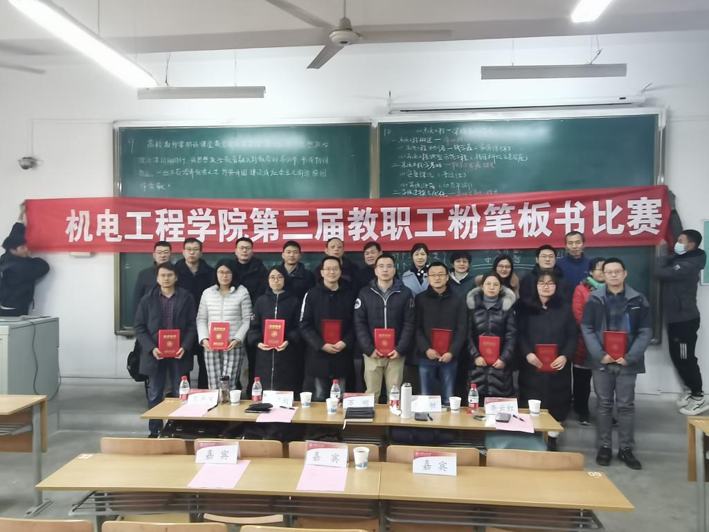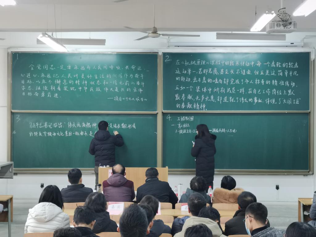 本次比赛的评委由校教务处处长万明、校教学督导专家王贯超、马克思主义学院教授曹敏、材料工程学院执行院长贺辛亥、电子信息学院副院长李云红担任。12名选手按照抽签顺序,分为6组依次上台书写、展示。板书内容为课程思政元素融入专业课程教学。经过评比,最终工业工程党支部书记宋栓军老师荣获本次比赛一等奖。