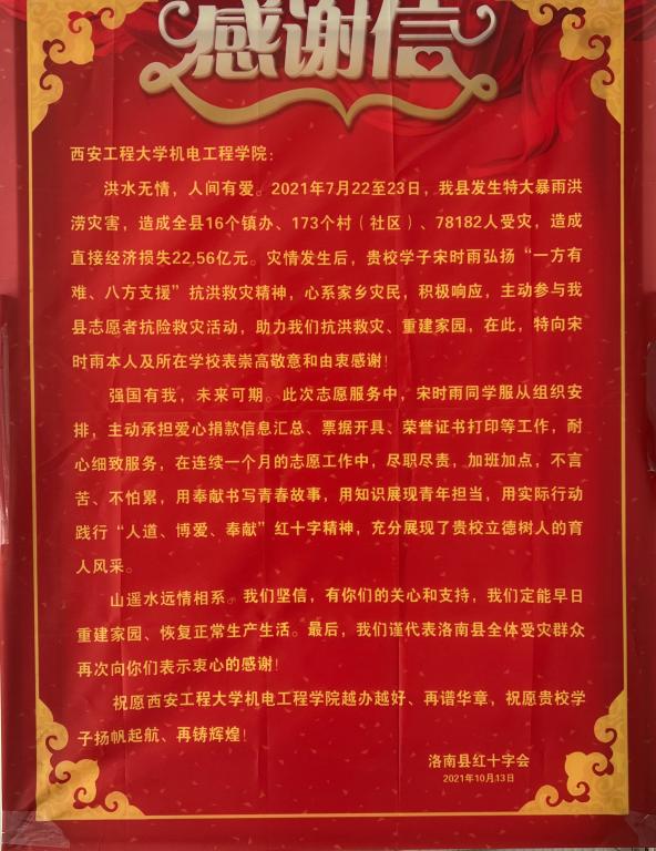 近日,澳门十大信誉网赌大全收到洛南县红十字会的一封感谢信,信中对澳门十大信誉网赌大全2019级机械设计制造及自动化2班宋时雨同学在今夏洛南县抗击特大暴雨洪涝灾害时的志愿服务表达感谢,对学校立德树人的育人成效予以赞赏。