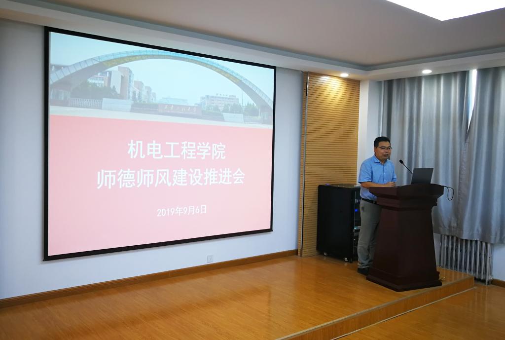 为贯彻落实校党委关于进一步加强教风学风建设专项行动的部署要求,在全国第35个教师节来临之际,2019年9月6日下午,澳门十大信誉网赌大全在临潼校区笃行楼学术报告厅举办以“弘扬高尚师德、潜心立德树人”为主题的师德师风建设推进会,校党委副书记赵小峰出席会议并讲话,机电学院全体教职工参加会议,机电学院党委书记王鸣媛主持会议。