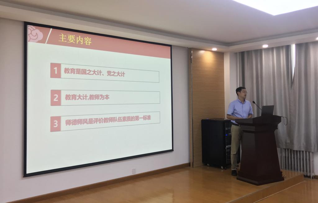 推进会上,马克思主义学院屈旻博士应邀做了题为《新时代教师的光荣使命》的专题讲座,从“教育是国之大计、党之大计”、“教育大计,教师为本”和“师德师风是评价教师队伍素质的第一标准”三个方面详细解读了十八大以来习近平总书记关于教育的重要论述精神,通过对当今世界复杂的国际形势的分析,论述了新时代赋予教师的使命和责任,阐述了师德师风建设的内涵和标准。屈旻博士围绕落实立德树人根本任务,分享了自己对课程思政的理解思考和实践,在构建“三全育人”格局、凝聚育人合力方面为全院教职工提供了很好的启示和借鉴。