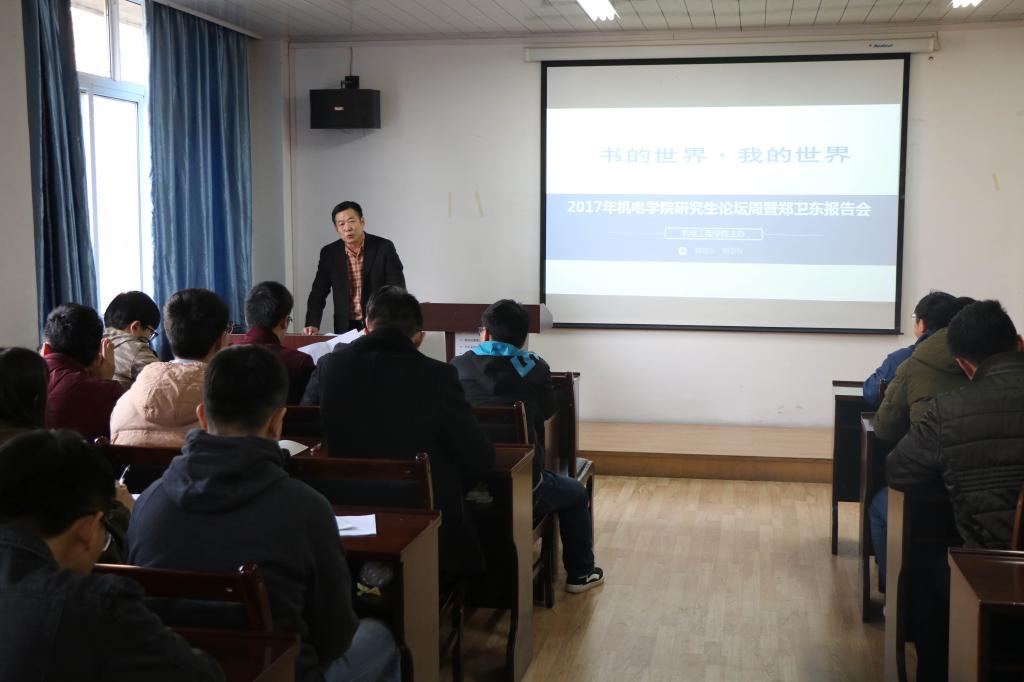 12月6日,机电学院举办研究生学术论坛活动周第三场报告会,本次报告会邀请十大信誉网赌教工读书协会会长郑卫东老师做了题为“书的世界,我的世界”的主题报告会。机电学院师生100余人参加了本次报告会,报告会由金守峰主持。