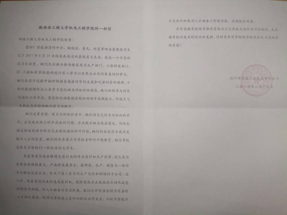 企业实习是初入职场的第一步,也是专业知识常新和发展的源泉,是检验真理的试金石,也是大学生锻炼成长的有效途径。7月上旬,机电学院党委副书记魏哲积极联系温州市蓝道工业发展有限公司为2018届毕业生提供暑期实习岗位。经学生个人申请和学院、企业筛选,企业为2014级包装工程专业学生申丹、郑瑞洁和机械设计制造及其自动化专业易凡、刘雯四名同学提供了实习机会,于7月12日至8月26日在公司实习。