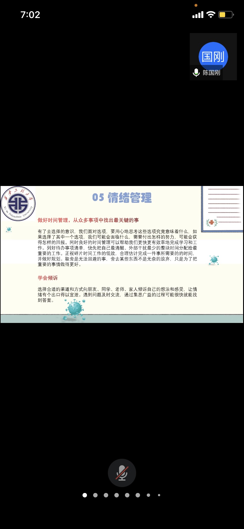 ——加强“情绪管理”,开展“心理云班会”。云班会结合学生实际需要,由各班级心理委员通过查资料、做视频的方式向学生普及情绪管理的概念、内涵及情绪管理的方法,提出让学生用正确的方式,探索自己的情绪,理解自己的情绪,放松自己的情绪。通过活动提高了学生对情绪的自觉意识,不断进行自我激励和自我完善,保持健康良好的心态。