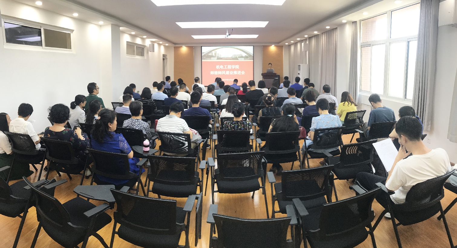 开展师德教育,强化教风学风建设。学院举办了以“弘扬高尚师德、潜心立德树人”为主题的师德师风建设推进会,邀请马克思主义学院屈旻博士做了题为《新时代教师的光荣使命》的专题讲座;学院近年来获得校级“师德先进个人”和“优秀教师”称号的五位教师代表作交流发言,分享了自己落实立德树人根本任务的感悟和体会。