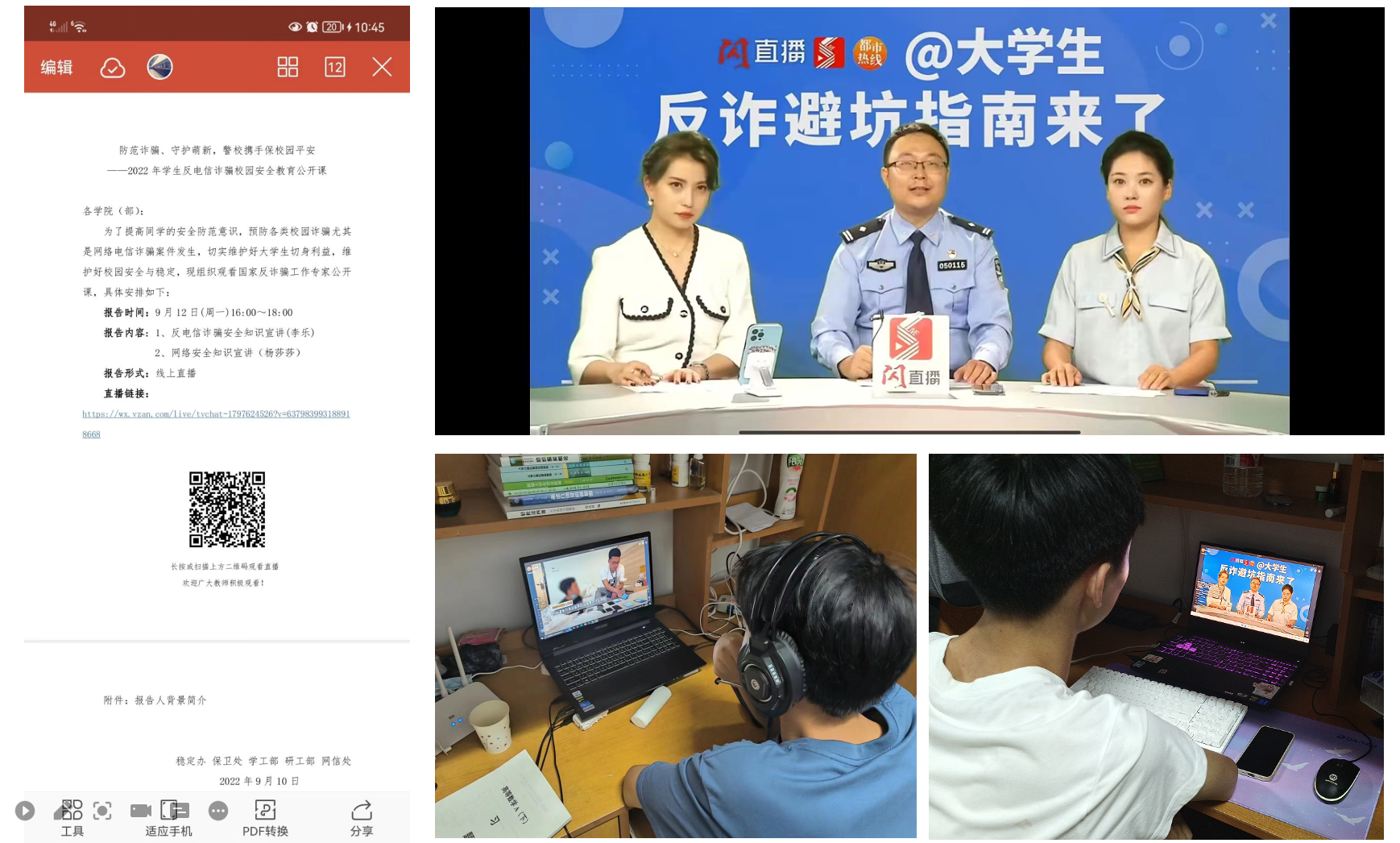 9月9日、12日、14日,学院积极组织2022级新生收看由市公安局等部门联合举办的【@大学生反诈避坑指南来了】主题线上直播活动,由澳门信誉最好十大平台举办的《防范诈骗、守护萌新,警校携手保校园平安——2022年学生反电信诈骗校园安全警示公开课》,由澳门十大信誉网赌大全举办的《开学季防诈防骗知识宣讲会》《新生安全教育》,通过众多典型案例,不断提升学生安全防范意识,预防各类校园诈骗案件发生,切实维护好大学生切身利益,维护好校园安全稳定。9月12日,学院邀请大学生心理健康教育与咨询中心副主任田珍珍从新生面临的三大变化、新变化带来的新冲突、新生心理调适方法集锦等3个方面做了大学新生心理适应的专题报告,同学生感兴趣的话题进行了深入互动,帮助新生明确方向,从“心”保驾护航。