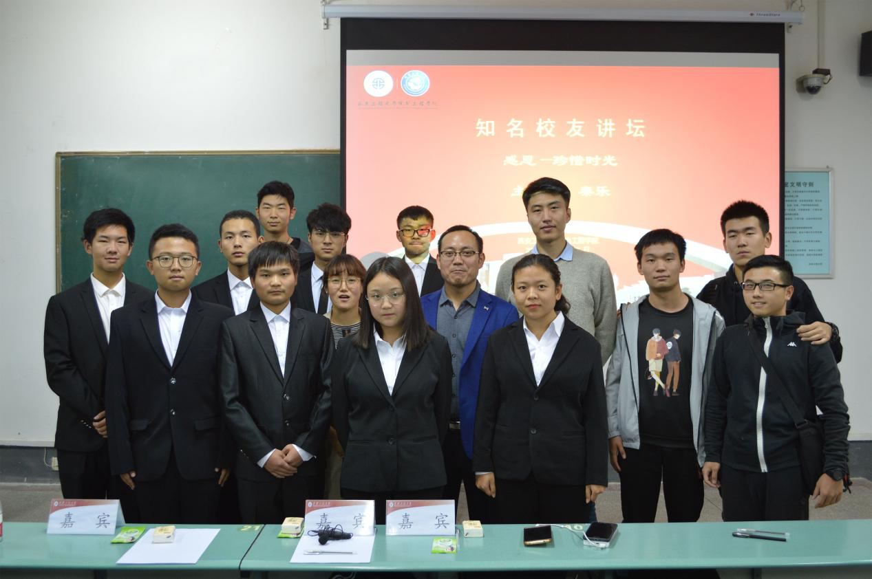 举办知名校友交流会,旨在以优秀校友自身的经历、体会、人生态度为在校学生树立良好榜样,为在校学生今后的发展提供参考与学习的榜样。讲座中,秦乐结合自己的大学生活以及职业生涯,向同学们具体讲述了其学习方法、勤工俭学、校园创业等真实故事,表达了他对于大学生独立精神的看法,并分享了自己职业生涯初期的困难和最后通过自身坚持努力获得成功的往事,勉励同学们“遇到困难不要放弃,努力改变,困难会使人成长”。在交流提问环节中,同学们就自己在学习生活方面的困惑踊跃提问,秦乐饱含热情,对同学们的问题一一解答。