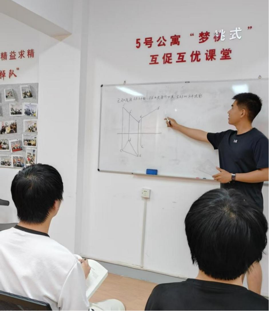 作为工科学生,大家都知道,《画法几何及机械制图》是一门兼具空间思维与细节把控难度的课,身边就有不少同学被抽象的投影原理和复杂的线条标注难倒过。梁振宇就结合制图国赛经历和三维设计软件,CAD建模,3D打印出三棱锥、齿轮泵这些教具,用实体模型让同学们直观感受线面投影关系,突破“平面图形—立体想象”的认知壁垒,把抽象的制图原理变得可触可感,成为小课堂上的学习利器。辅导之余,他还带领大家组建了校级飞盘俱乐部,跨学院成立了“飞盘趣缘搭子团”,如今俱乐部已发展超过80人,盘不落地、永不放弃的飞盘精神,让他们劳逸结合,以更好的状态投入学习。
